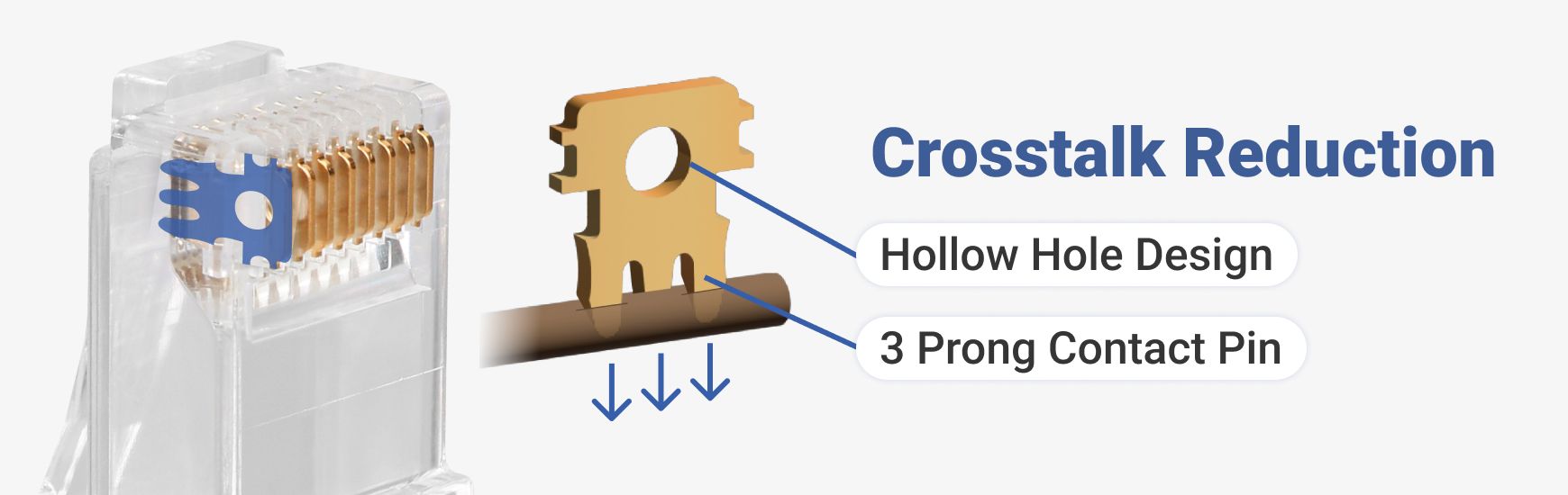The 3 prong contact pin and the hollow hole design of our 8P8C plug significantly reduce crosstalk and enhance the stability of networking connection. Our 8P8C modular plug features the 3 prong design that is compatible with both 24 to 26 AWG solid and stranded network cables. Moreover, the 3 prong contact pins branch off only after wire insertion, which prevents displacement of the contact points between the pins and copper conductors caused by thermal expansion and contraction. Additionally, the hollow hole design of 8P8C plug's contact pin reduces the area of exposed copper, reducing oxidation and crosstalk interference.